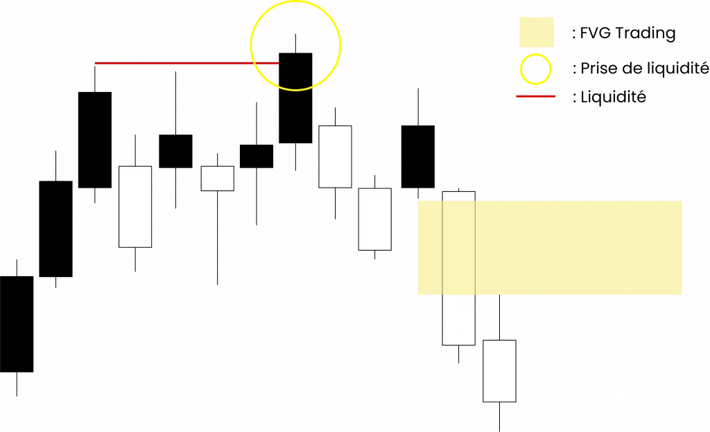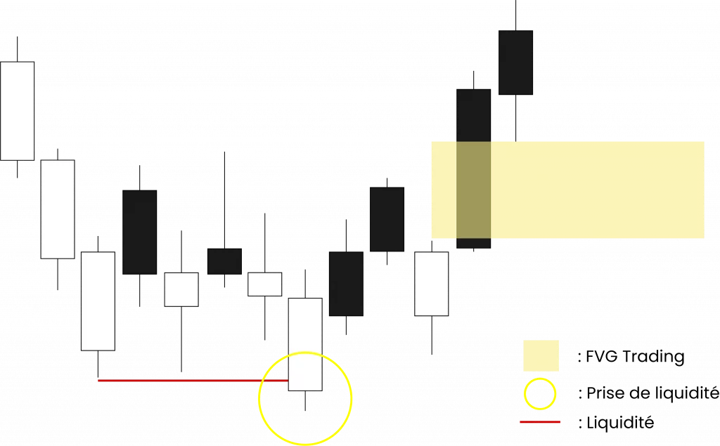 Comme on peut le voir sur le schéma ci-dessus, le prix augmente drastiquement après une ancienne prise de liquidité et laisse derrière lui une FVG que l’on reconnaît facilement grâce au pattern à 3 bougies qu’ICT a popularisé pour repérer un Fair Value Gap.