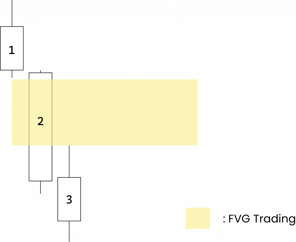 A l’inverse pour noter votre FVG Baissier, il suffit de rejoindre la mèche inférieure de la bougie 1 à la mèche supérieure de la bougie 3 pour tracer votre zone de Fair Value Gap.