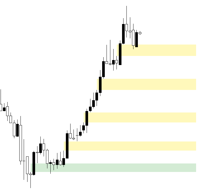 Étant donné qu’elles sont à l’origine de ces mouvements puissants, elles émettent un nombre considérable d’ordres d’achat. Il est donc bénéfique pour elles que le prix ne descende pas en dessous de ces niveaux, et elles feront tout pour alimenter la tendance qu’elles ont créée afin d’éviter de mettre leurs positions en pertes.