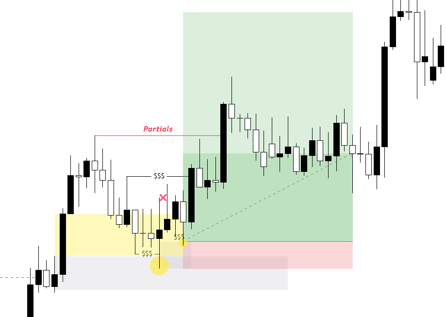 Je note également qu’un Fair Value Gap est visible directement après le POI, je l’annote donc et le prix vient le combler assez rapidement avant de revenir dans mon POI et d’établir une superbe accumulation de Wyckoff qui me permet de placer une position acheteuse gagnante.